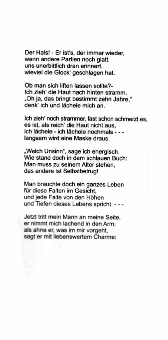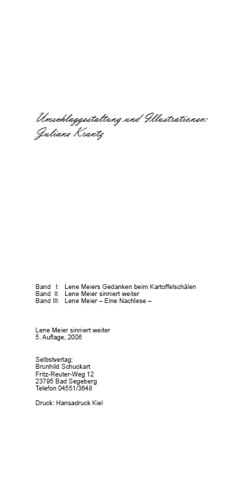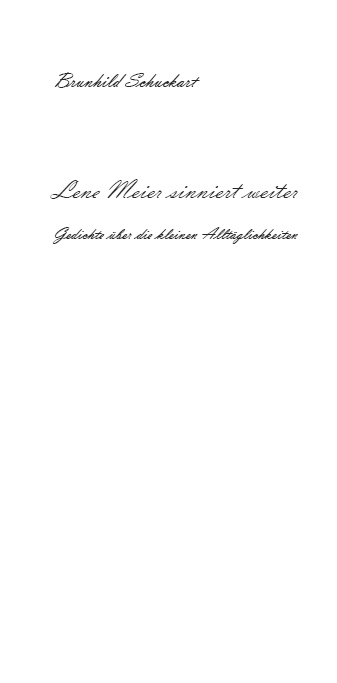 In diesem Band lässt die Autorin Brunhild Schuckart die Durchschnitts-hausfrau Lene Meier erneut zu Wort kommen. In 14 Gedichten sinniert Frau Meier - mittlerweile über sechzig - vor allem über das Älterwerden sowie ihren Alltag im letzten Lebensdrittel. Auf bewährt humorvolle Weise beschreibt sie ihre Empfindungen, Gedanken und Erfahrungen